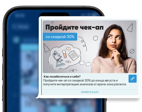 Провели тестирование трех креативов на каждую группу таргетинга с выделением УТП. Например, при таргетинге на конкурентов выделили акционную цену, которая была ниже, чем у других клиник. На момент продвижения лаборатории в Telegram клиент не использовал другие источники трафика, но мы рекомендовали использовать UTM-метки в ссылке на лид-магнит «Чек-ап», чтобы затем провести более глубокий анализ по обращениям на эту услугу.