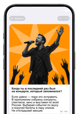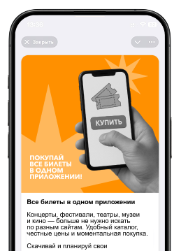 Если давно — пора это исправить. В приложении собраны концерты, спектакли, кино и выставки по всей России. Выбирай события по вкусу и покупай билеты в пару кликов. Не откладывай эмоции.